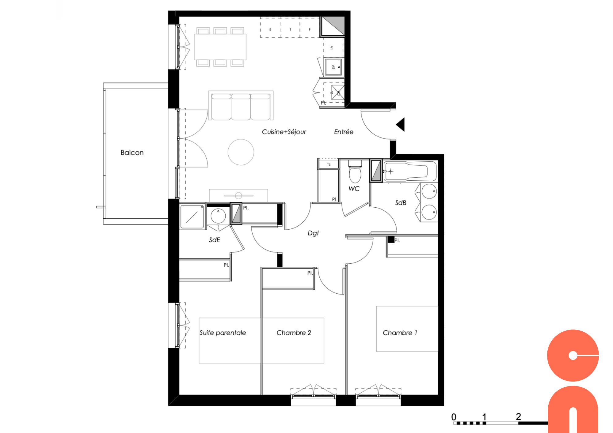 Situé au 1er étage sur 2 de la Résidence, il profite d’un emplacement privilégié à l’arrière, avec un balcon de 8 m² sans vis-à-vis.
